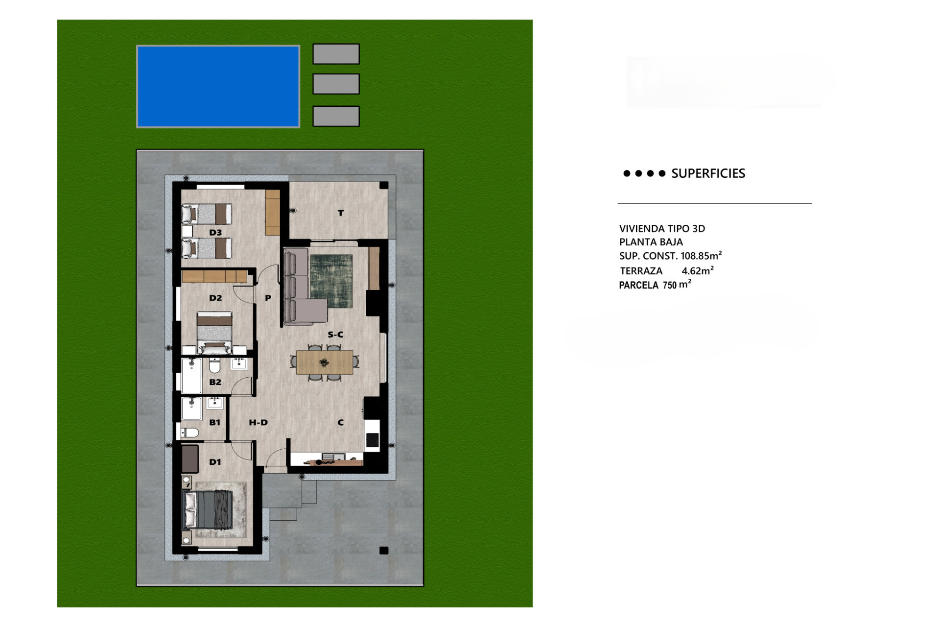 Cada propiedad se asienta sobre una espaciosa parcela de 750 m², ofreciendo un ambiente privado y tranquilo, ideal para disfrutar del clima mediterráneo. Las villas, con 108,85 m² construidos, incluyen una hermosa piscina privada de 18,00 m² y zonas de terrazas delanteras y traseras, permitiendo el disfrute del sol durante todo el año.