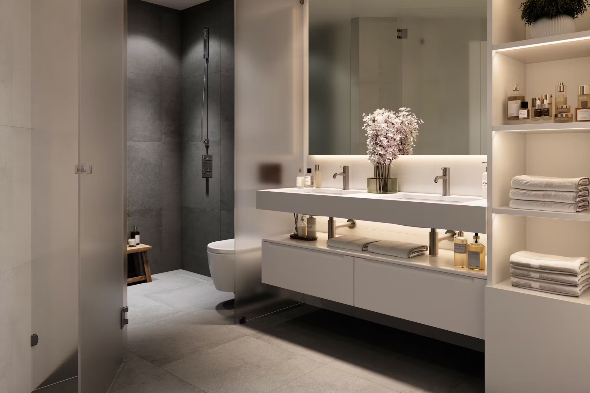 L'intérieur des logements est conçu avec un accent sur la qualité et le confort. Les appartements, rez-de-chaussée et penthouses offrent des options de 2 et 3 chambres, tous avec 2 salles de bains, assurant un espace suffisant pour les familles et les visiteurs. Les logements sont équipés de sols en grès cérame, apportant une touche moderne et élégante. De plus, ils disposent de chauffage par le sol, offrant une ambiance chaleureuse et accueillante pendant les mois les plus froids. L'inclusion d'appareils modernes et d'un système domotique avancé garantit une expérience de vie confortable et efficace. Les placards intégrés offrent des solutions de rangement pratiques et esthétiques.
