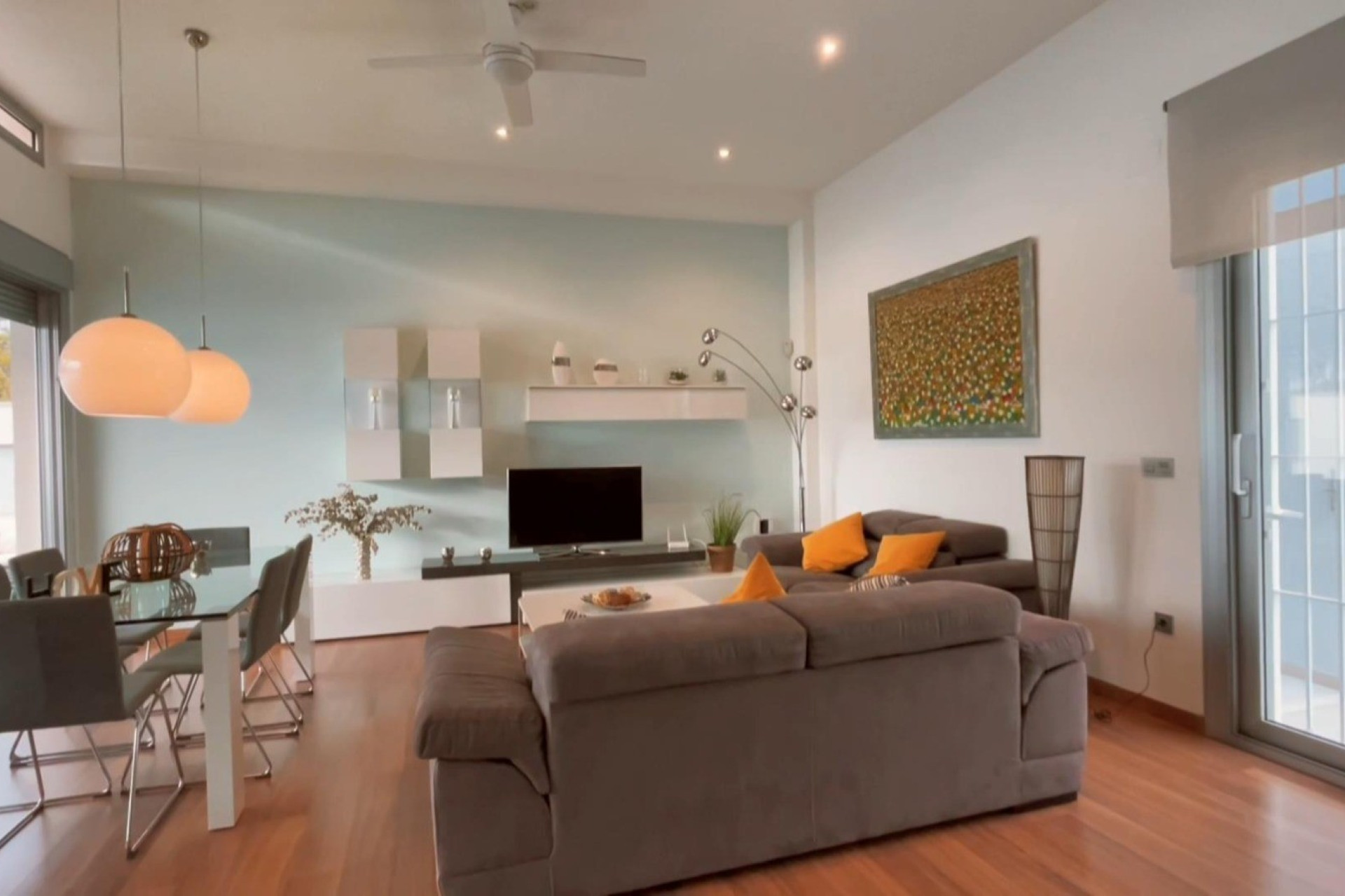 The upper floor houses three bedrooms, all with built-in wardrobes offering ample storage space. The master suite not only has an ensuite bathroom but also a private terrace with beautiful views of the surroundings. The other two bedrooms share a well-equipped bathroom.