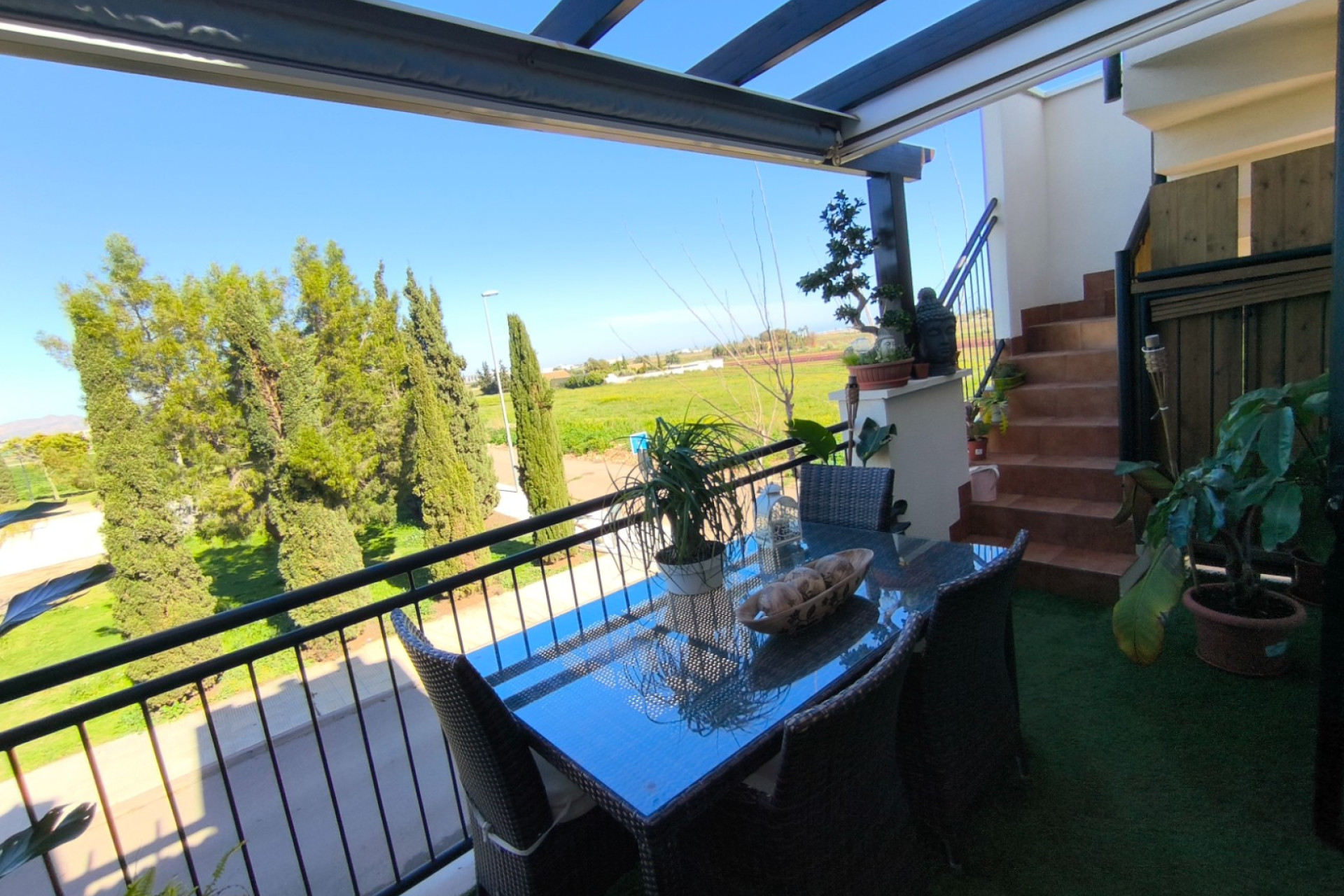 The balcony leads to a large solarium with wooden flooring and a glass enclosure, where a charming raised reading area is located. From here, you can enjoy the natural surroundings as well as stunning views of the Mar Menor and La Manga del Mar Menor.