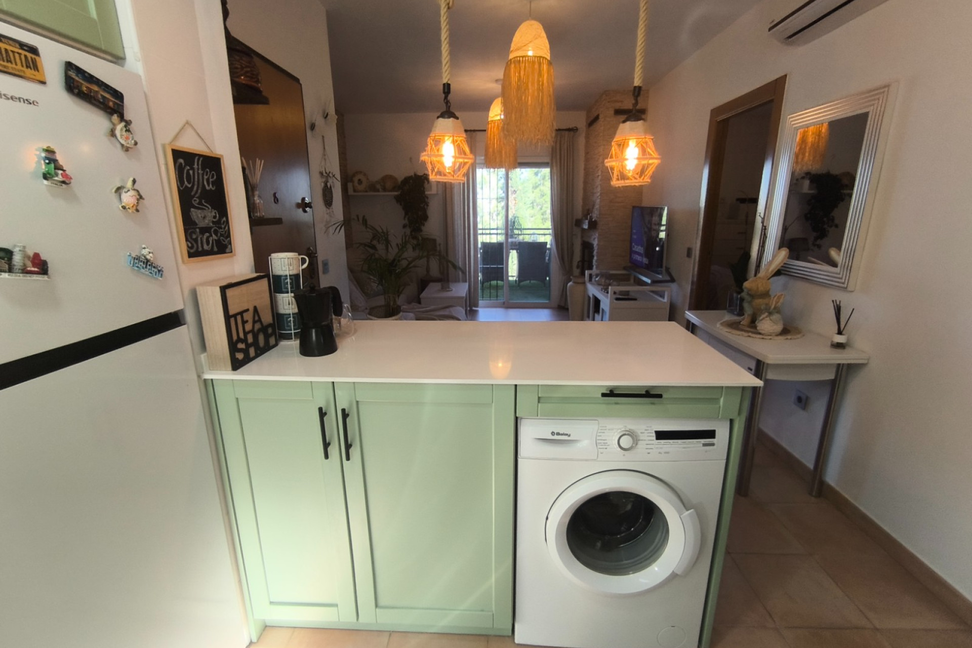 From the living room, there is access to a spacious balcony fitted with top and vertical awnings, allowing it to be enjoyed throughout the year. This outdoor area features artificial grass, a relaxation area, and a dining space, perfect for leisure and social gatherings.