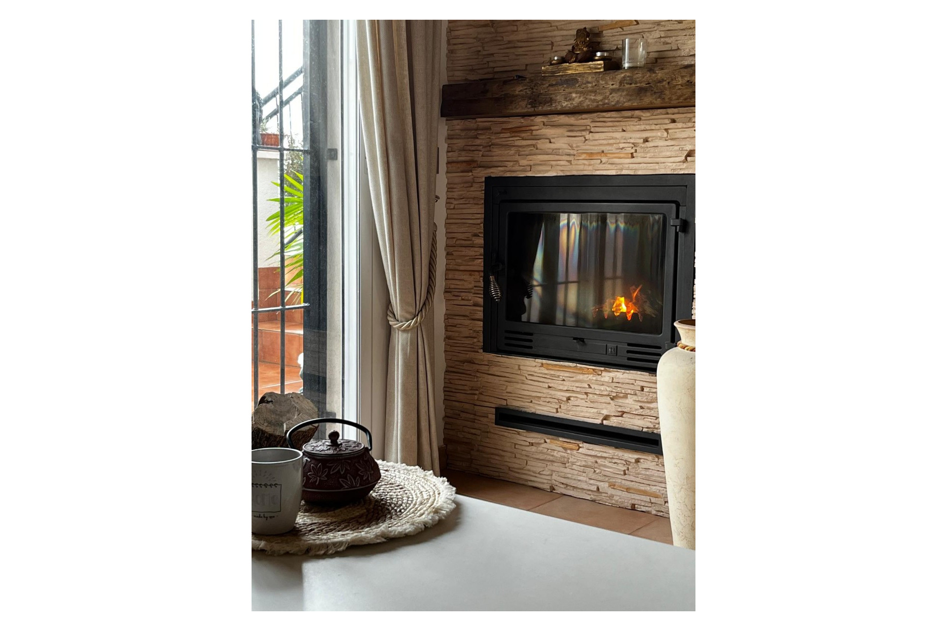 The property features a cozy living room with a air-circulation fireplace and thermal and acoustic insulation wall cladding, creating a warm and energy-efficient atmosphere all year round. The fully renovated open-plan kitchen includes a breakfast bar, undermount sink, and soft-close cabinets, combining modern design with functionality.